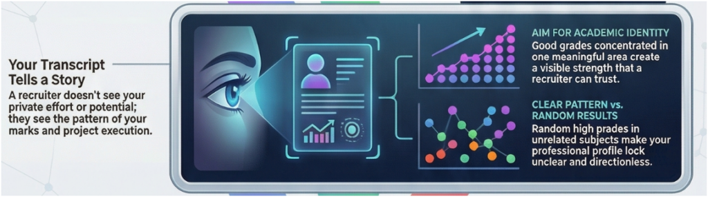 A recruiter does not know your struggle, your potential, or your private effort. They see your marks, your course grades, your projects, and your resume. So ask yourself: what does your transcript clearly show?